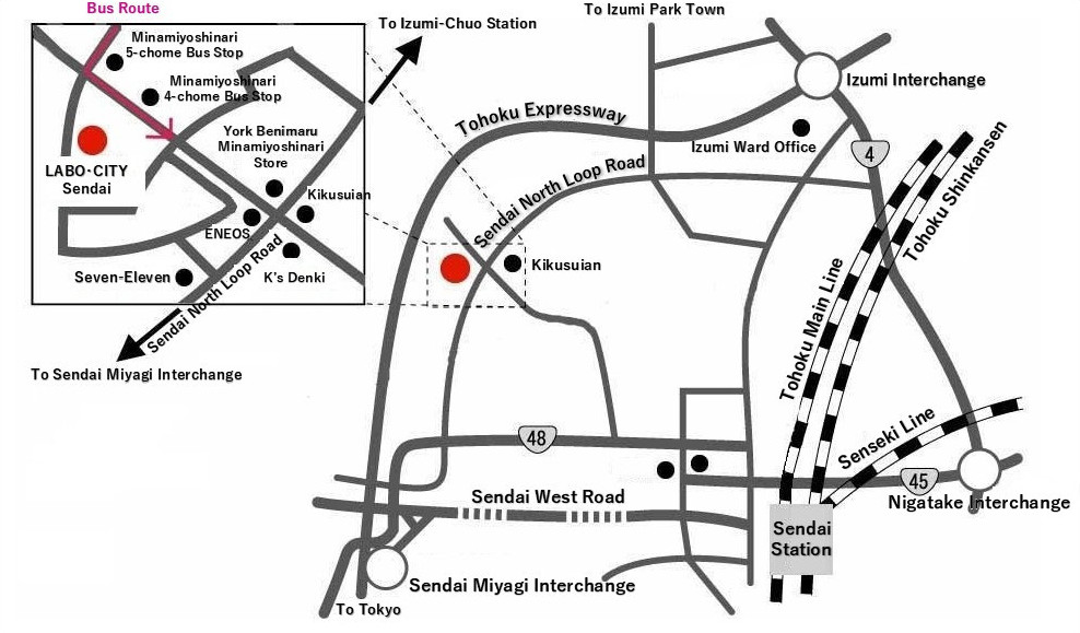 From JR Sendai Station, it takes approximately 45 minutes by bus (37 minutes) and on foot (8 minutes).